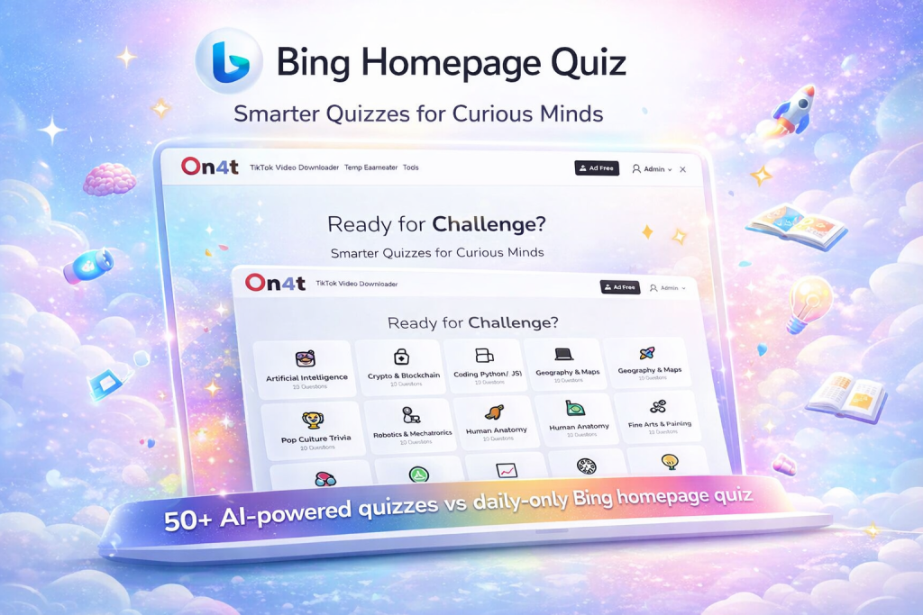 The On4t Bing Homepage Quiz is a smarter and more flexible alternative for users who enjoy the Bing homepage quiz. This AI-powered quiz tool allows you to play unlimited quizzes across dozens of categories including technology, science, history, sports, finance, and pop culture, with fresh AI-generated questions on every visit and no signup required.